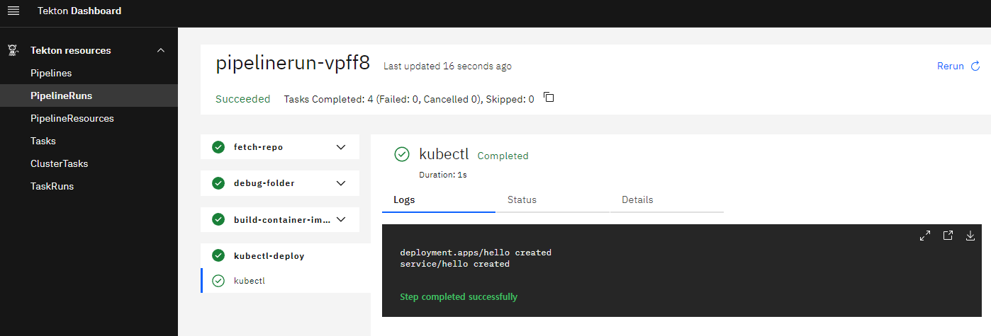 다시 pipelinerun을 실행하면 다음과 같이 배포가 완료됨을 볼 수 있다.