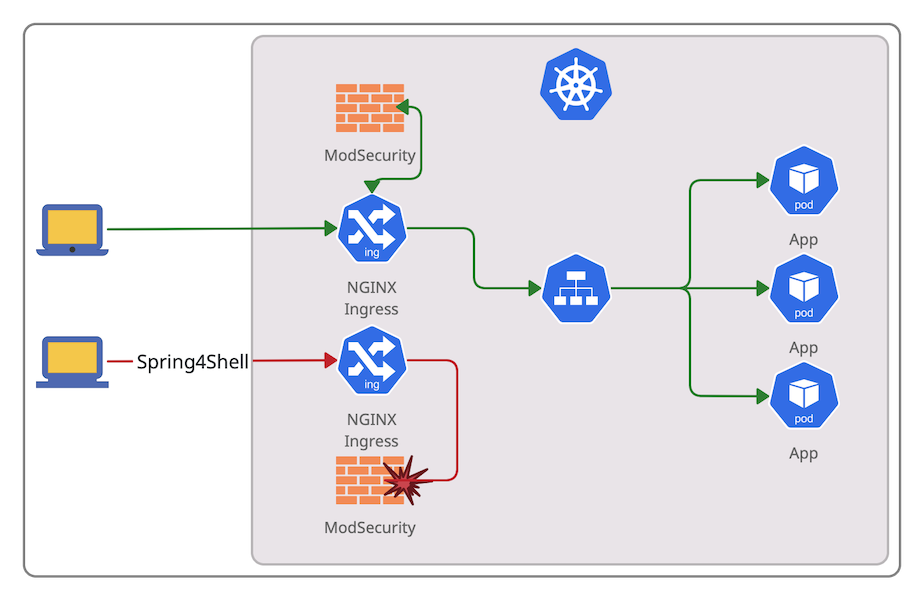 ModSecurity가 활성화되지만, 수신 리소스에 대해서는 아직 작동하지 않는다. 이를 위해서는 Ingress 주석도 적용해야 한다.