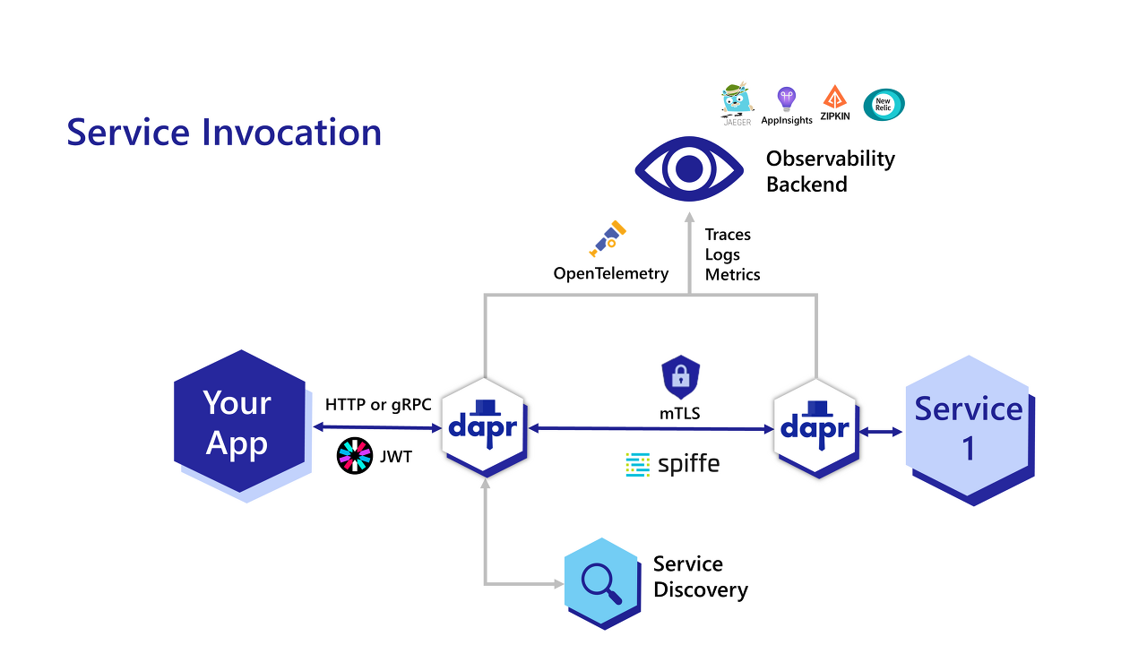 Dapr의 서비스 호출 API를 통해 개발자는 서비스 이름에 대한 메서드를 호출하는 반면 서비스 메시는 IP 주소 및 DNS 주소와 같은 네트워크 개념을 처리한다. 그리고 Dapr은 라우팅 또는 트래픽 분할과 같은 트래픽 동작에 대한 기능을 제공하지 않는다.