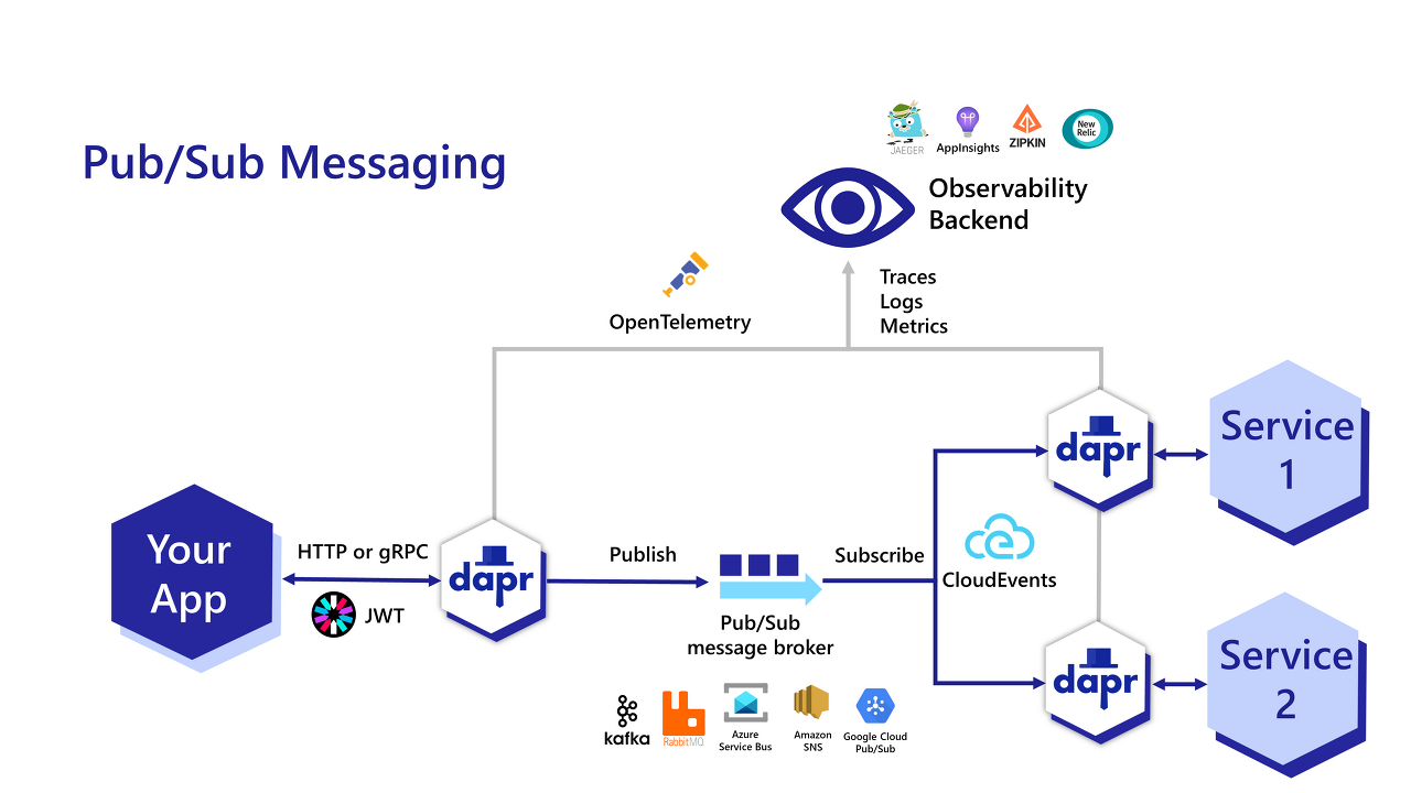 Dapr은 각 컴퓨팅 유닛에 사이드카(컨테이너 또는 프로세스)를 주입한다. 사이드카는 이벤트 트리거와 상호 작용하고 표준 HTTP 또는 gRPC 프로토콜을 통해 컴퓨팅 장치와 통신한다. 이를 통해 Dapr은 프레임워크나 라이브러리를 가져올 필요 없이 기존 및 미래의 모든 프로그래밍 언어를 지원할 수 있다.