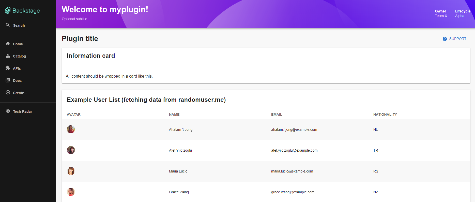 Plugin : Backstage 앱을 유용하게 만드는 추가 기능이다. 플러그인은 회사에 고유하거나 오픈 소스 및 재사용이 가능하다. Spotify에는 50개 이상의 팀이 만든 100개 이상의 플러그인이 있다.