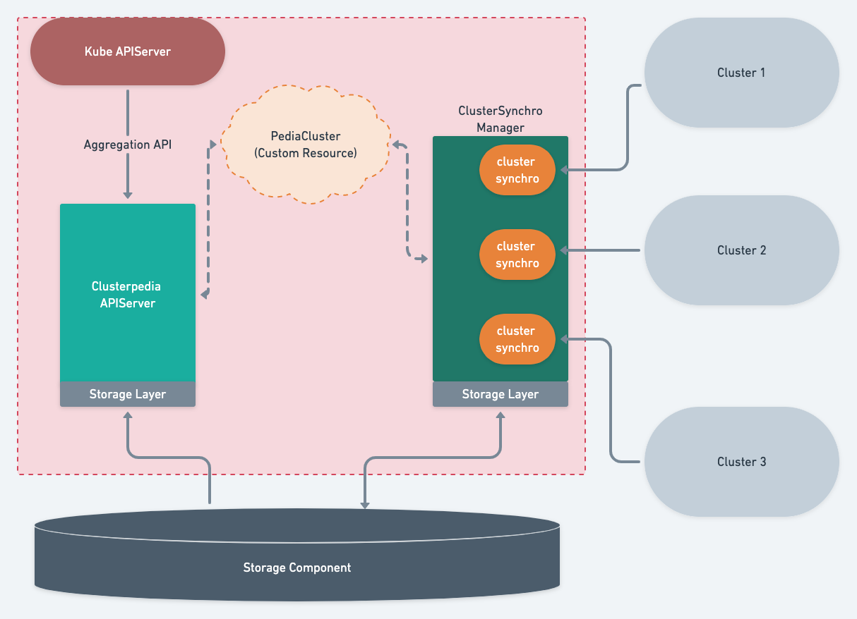 Clusterpedia의 주요 기능은 여러 클러스터에서 리소스에 대한 복잡한 검색을 제공하는 것이다. Clusterpedia는 PediaCluster리소스를 사용하여 클러스터에서 복잡한 검색을 지원해야 하는 리소스를 지정하고 이러한 리소스를 실시간으로 Storage Component Layuer에 동기화 한다.