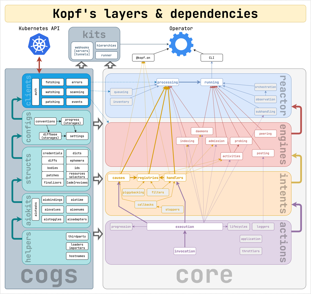 다른 프레임워크와 마찬가지로 Kopf는 오퍼레이터를 실행하고, 쿠버네티스 클러스터와 통신하고, 쿠버네티스 이벤트를 Kopf 기반 오퍼레이터의 순수 Python 기능으로 마샬링하기 위한 "외부" 툴킷과 "내부" 라이브러리를 모두 제공한다.