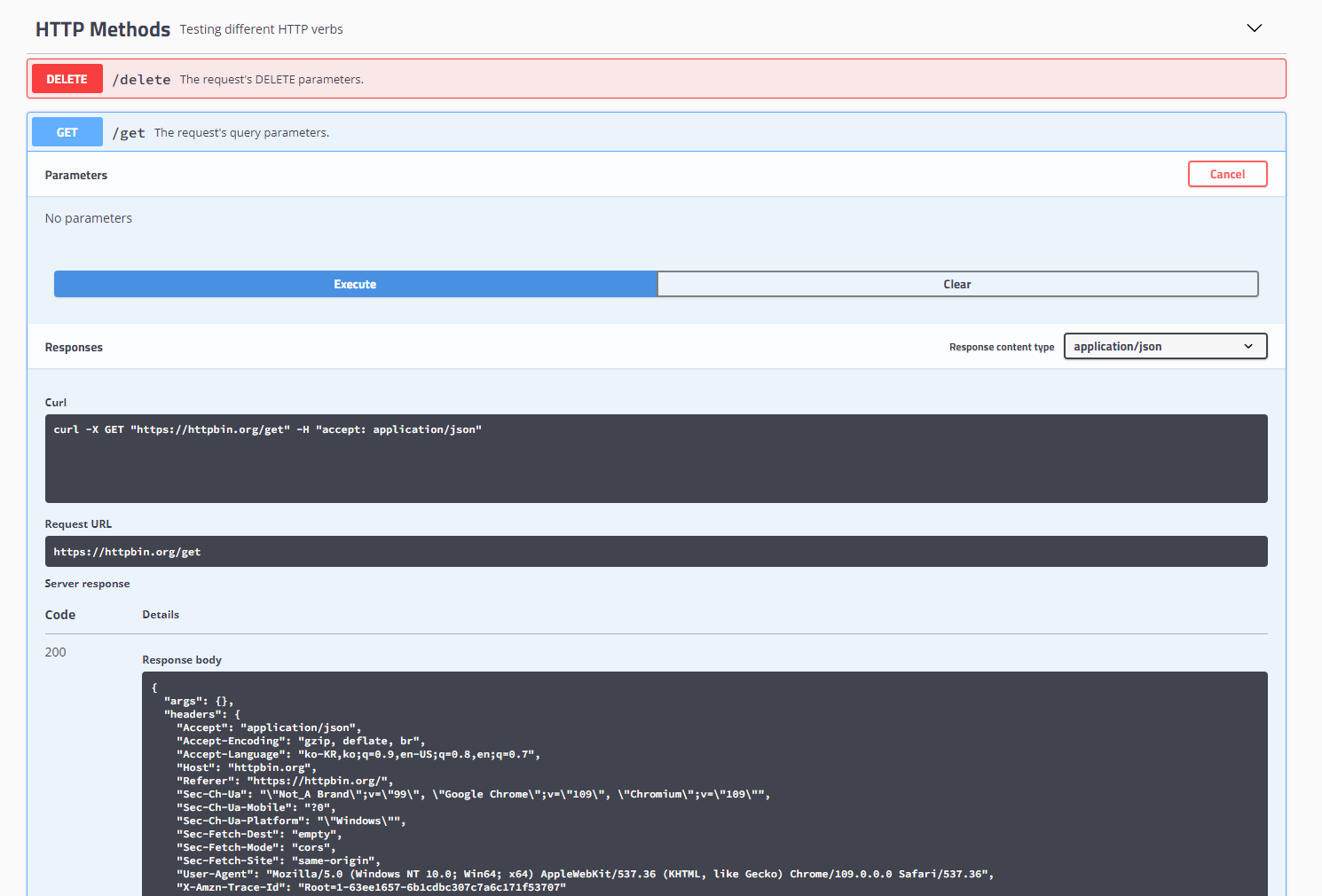 HTTP Methods 에서 /get method를 선택하여 실행하면 200 code가 리턴되는지 검증한다.