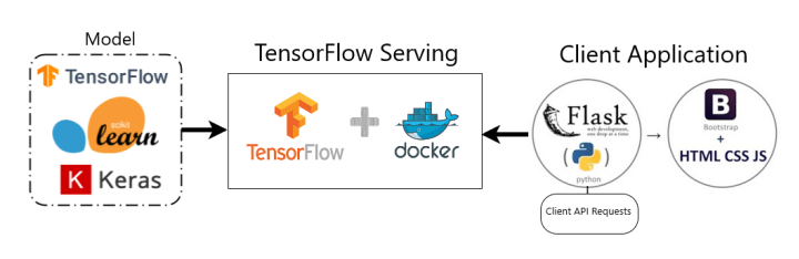 Model을 embeded 하여 서버를 운영하거나 모델만 API 서버로 구성한 후 클라이언트와 결과를 주고 받는 온라인 서비스 형태가 있다. 아래 그림은 TensorFlow Serving Container가 모델 API 서버 기능을 하고 Flask 가 클라이언트 역할을 하여 서비스 하는 형태가 될 수 있다.