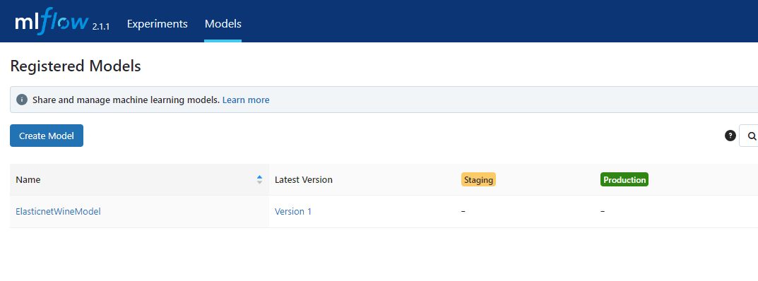 INFO mlflow.tracking._model_registry.client: Waiting up to 300 seconds for model version to finish creation. Model name: ElasticnetWineModel, version 2