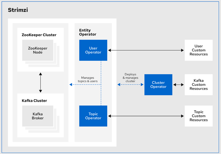 - Cluster Operator : Apache Kafka 클러스터, Kafka Connect, Kafka MirrorMaker, Kafka Bridge, Kafka 내보내기, Cruise Control 및 Entity Operator를 배포하고 관리