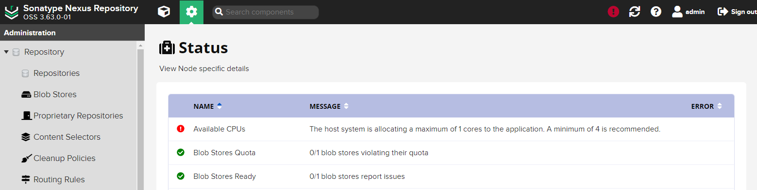 - 저장소 상태 확인: Nexus는 저장소에 대한 상태 확인을 수행하여 저장된 아티팩트에 문제가 있는지 식별하고 플래그를 지정할 수 있다.