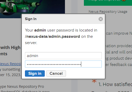 로그인을 시도할 때 admin 패스워드는 /nexus-data/admin.password 파일에 존재한다.