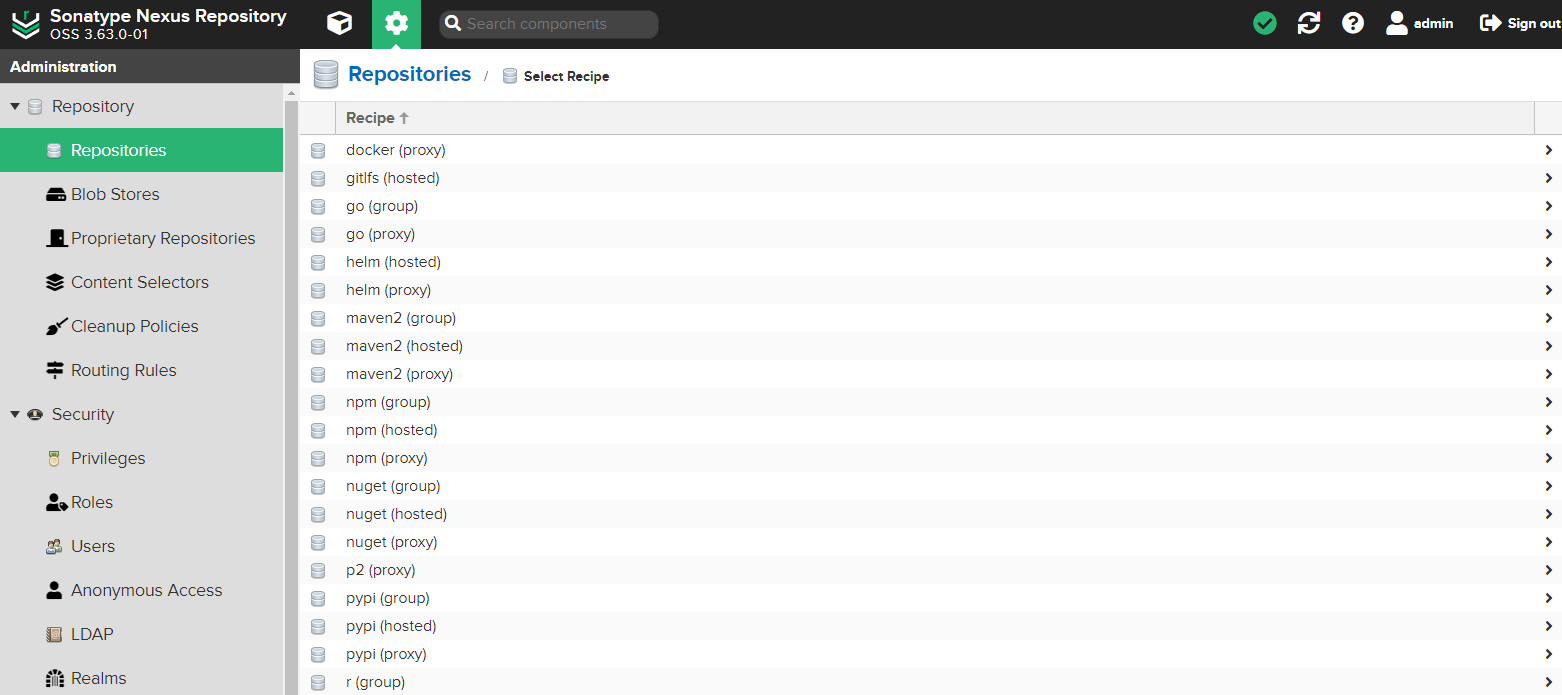Nexus 에 Pypi 저장소를 구축하는 방법을 알아보좌. 우선 Nexus 에 Repository -> Create repository 를 선택한다.