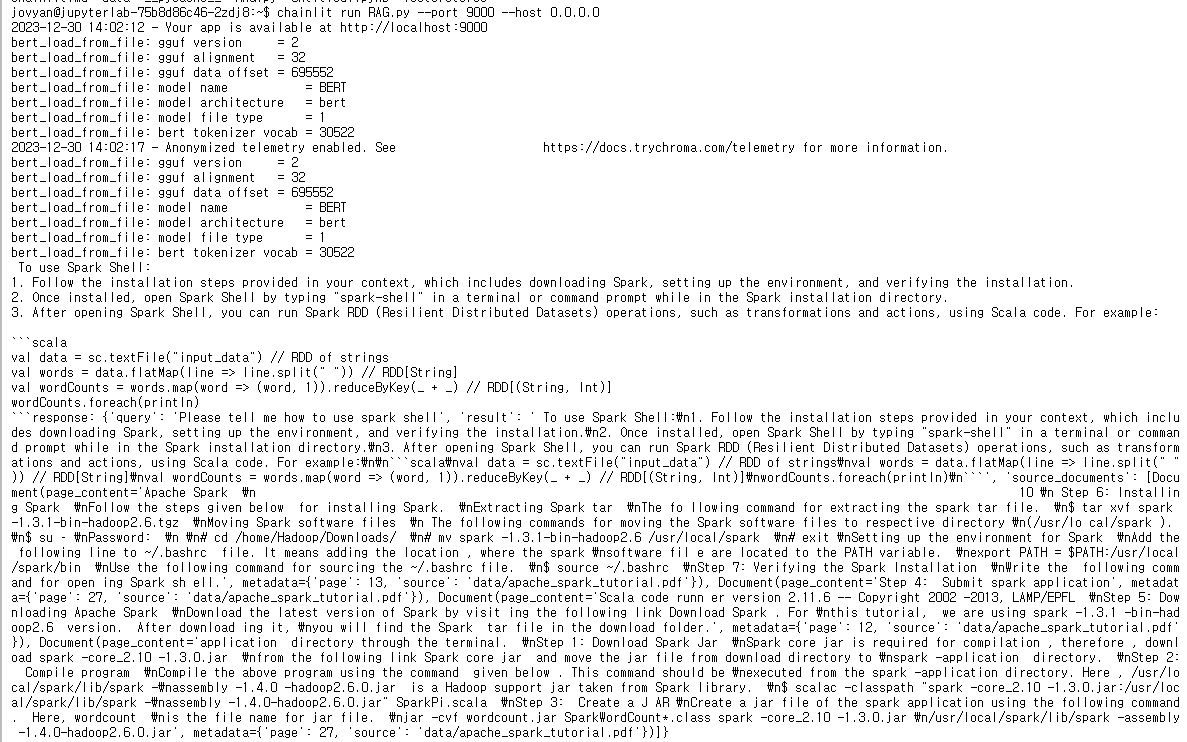 실행결과는 다음과 같다. spark shell에 대해 질문한 결과이다.