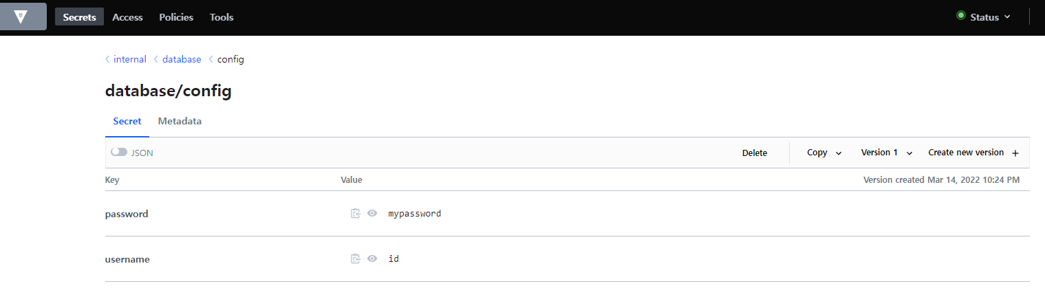 $ vault kv put internal/database/config username="id" password="mypassword"