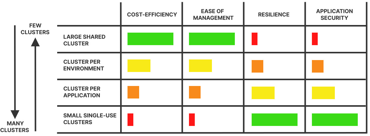 소수의 대규모 클러스터(각 클러스터에 많은 워크로드 포함) 또는 많은 클러스터(각 클러스터에 적은 워크로드 포함)에서 주어진 워크로드 세트를 실행할 수 있다.