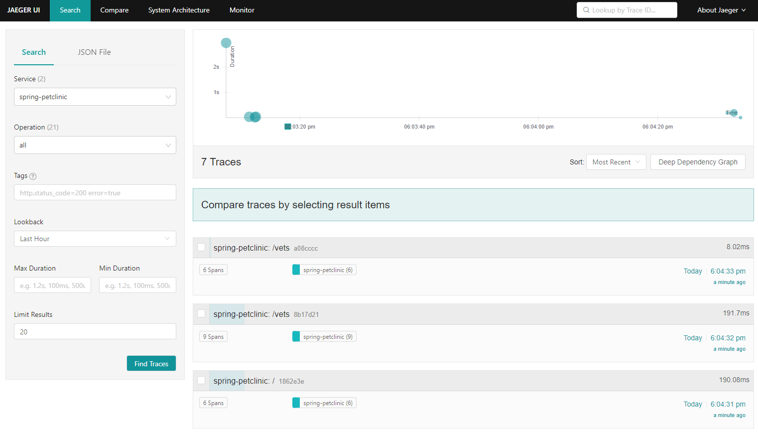 이제 Jaeger 화면을 조회하면 아래와 같이 spring-petclinic에 대한 trace 로그를 조회할 수 있다.