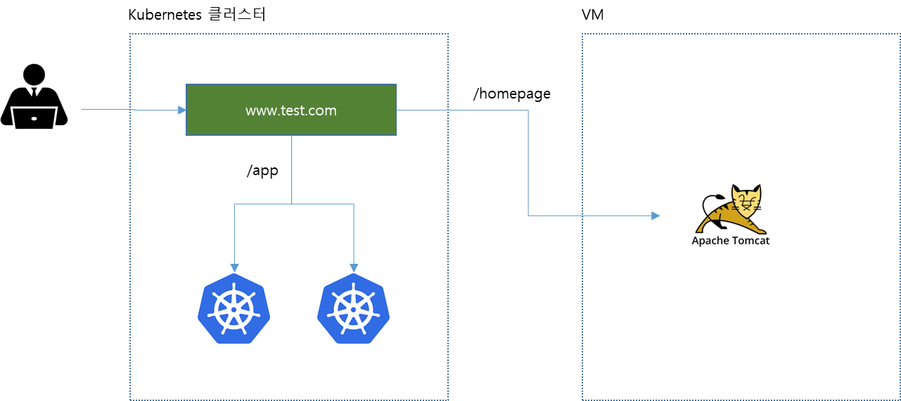 Kubernetes Cluster 에 배포된 application 이 아닌 일반 물리 또는 VM에 application 서비스 ( 예를 들어 Tomcat 서비스 )를 Nginx Ingress로 등록하여 사용하는 방법에 대해 알아보자. 구성은 아래와 같은 그림이 될 것이다.