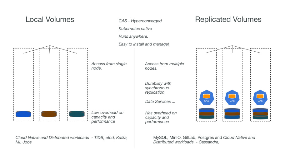 - Jiva – Jiva는 동기 복제와 같은 블록 스토리지 기능을 통해 사용자 공간에서 독점적으로 실행된다. 이 옵션은 더 많은 블록 저장 장치를 추가할 수 없는 노드에서 실행 중인 응용 프로그램이 있는 상황에 이상적이다. 그러나 이것은 고성능 스토리지 기능이 필요한 미션 크리티컬 애플리케이션에는 적합하지 않다.