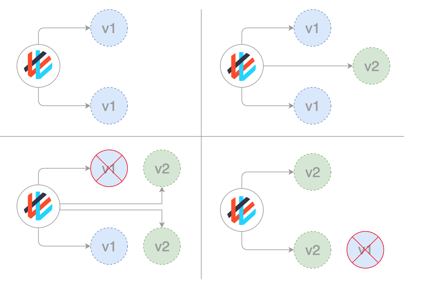 - RollingUpdate는 순차적으로 교체하는 방식이라서 운영중인 Pod개수, maxSurge, maxUnavailable 등의 옵션에 따라 지연 시간이 다르겠지만 이 시간 동안에는 기존앱과 신규앱이 사용자에게 동시에 서비스된다.