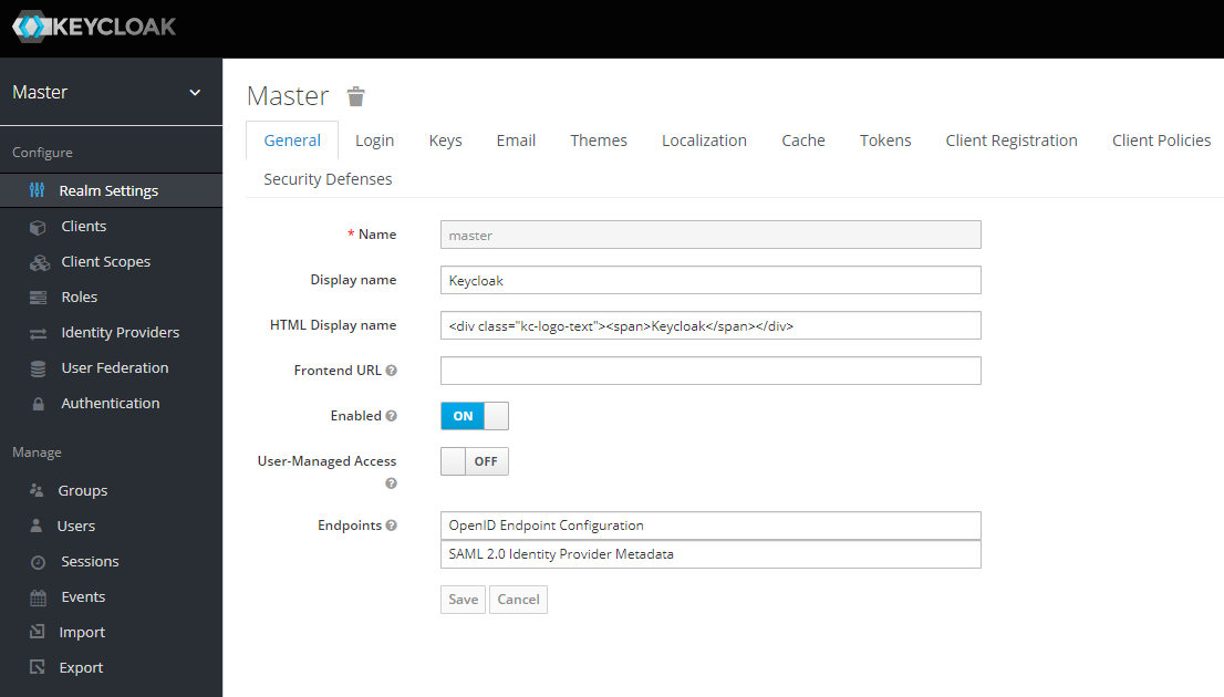 | Realms | 사용자, 자격 증명, 역할 및 그룹 집합을 관리한다. 사용자가 이 Realm에 속하고 로그인한다. Realm은 서로 격리되어 있으며 자신이 제어하는 사용자만 관리하고 인증할 수 있다. |