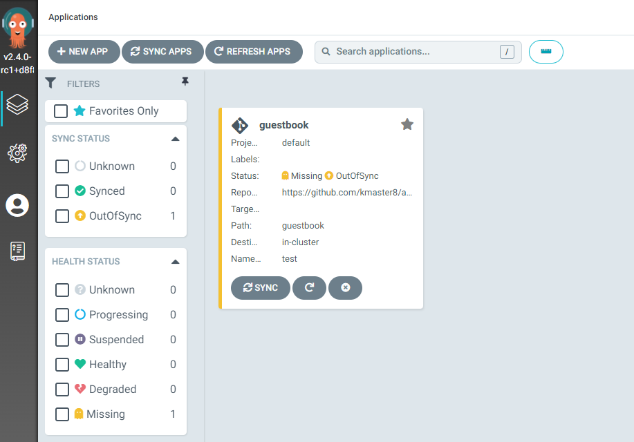 apps Deployment test guestbook-ui OutOfSync Missing