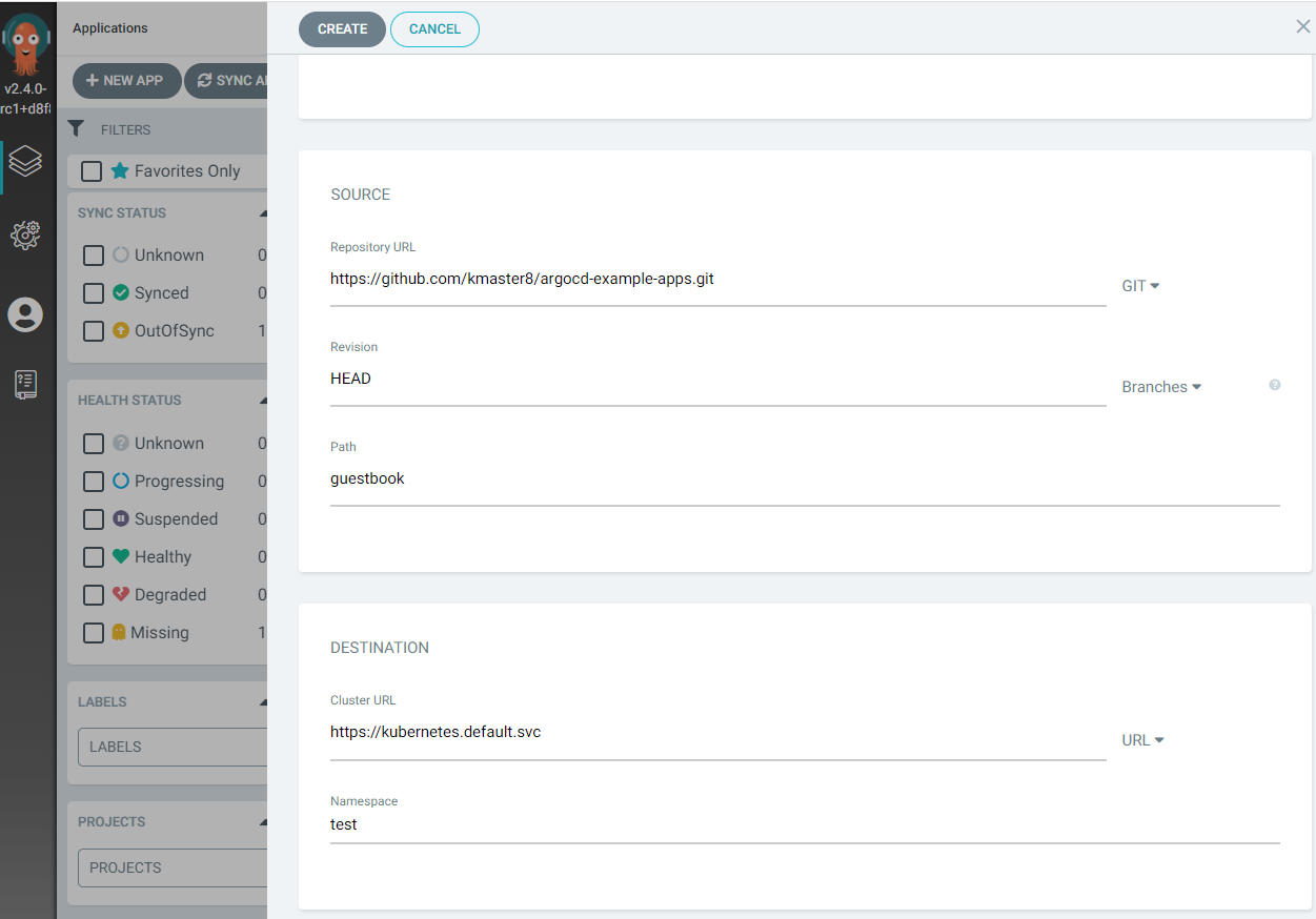 # argocd app create guestbook --repo https://github.com/kmaster8/argocd-example-apps.git --path guestbook --dest-server https://kubernetes.default.svc --dest-namespace test