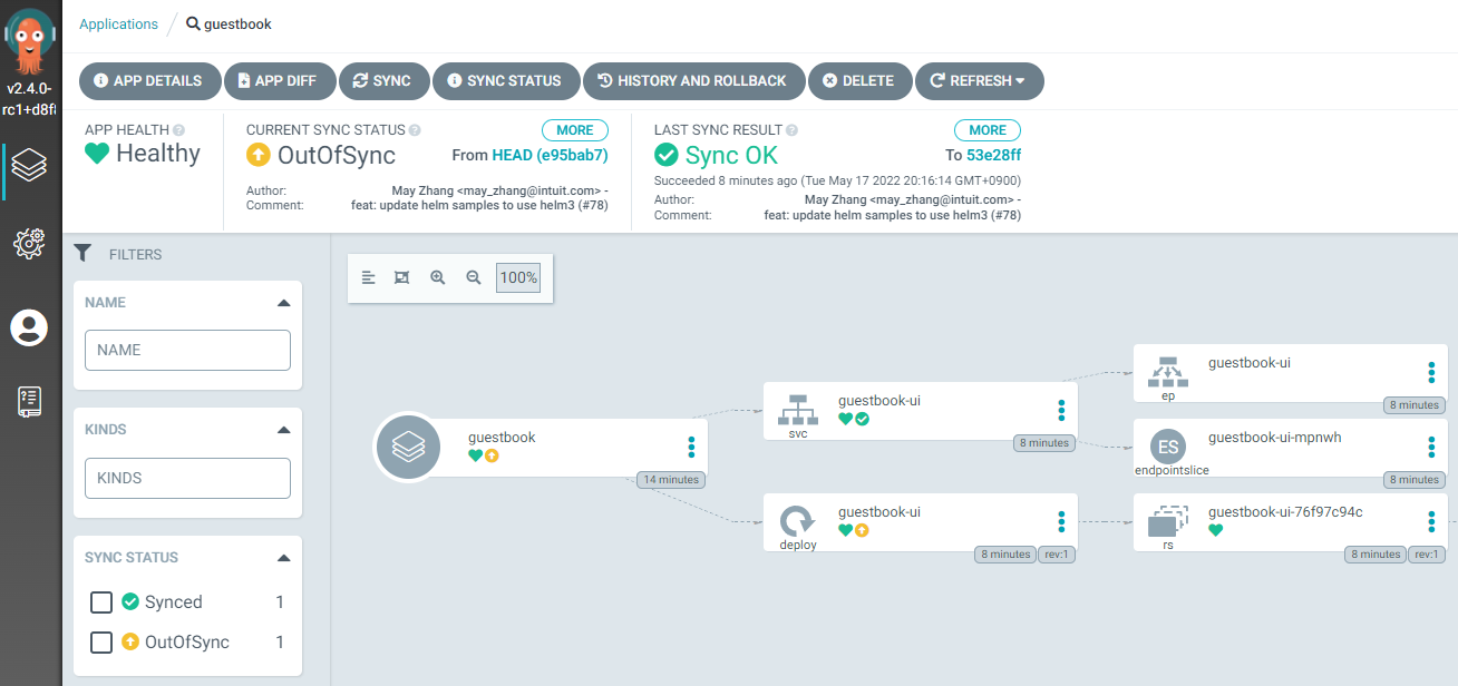 2022-05-17T20:16:14+09:00 apps Deployment test guestbook-ui OutOfSync Missing deployment.apps/guestbook-ui created