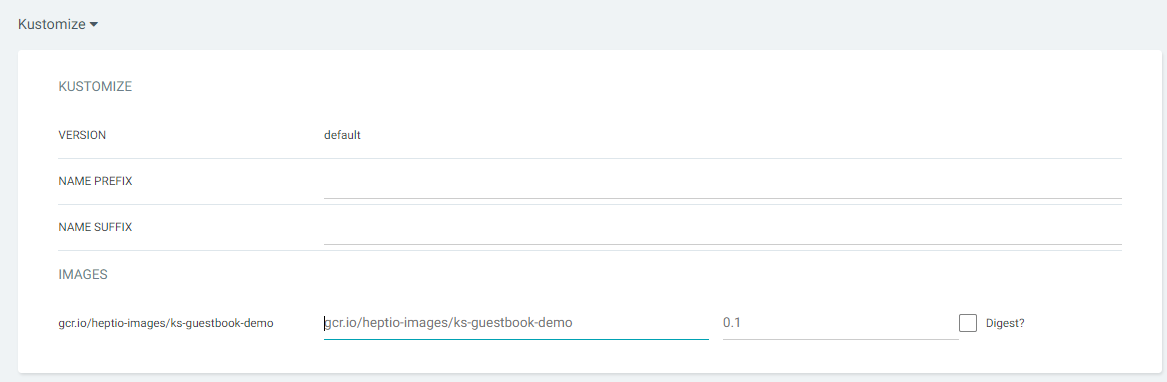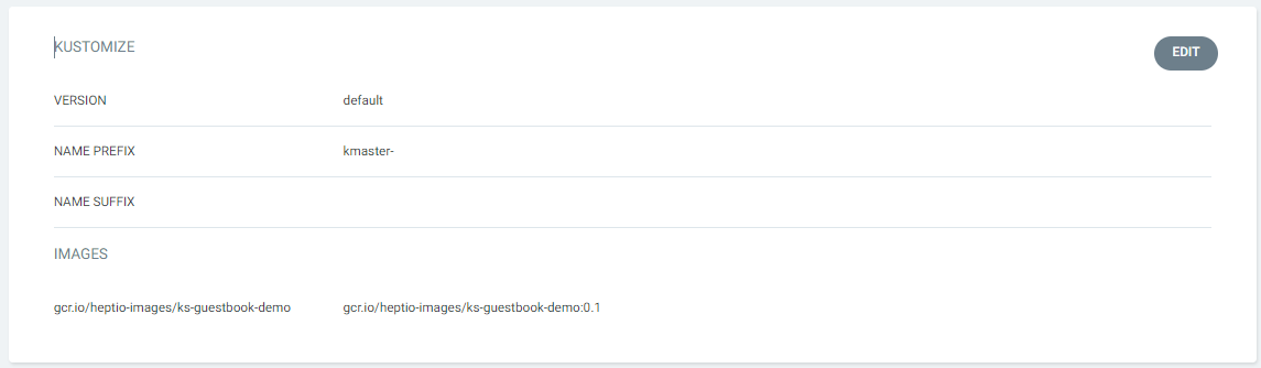 - NAME SUFFIX : Kustomize 앱의 리소스에 추가되는 접미사