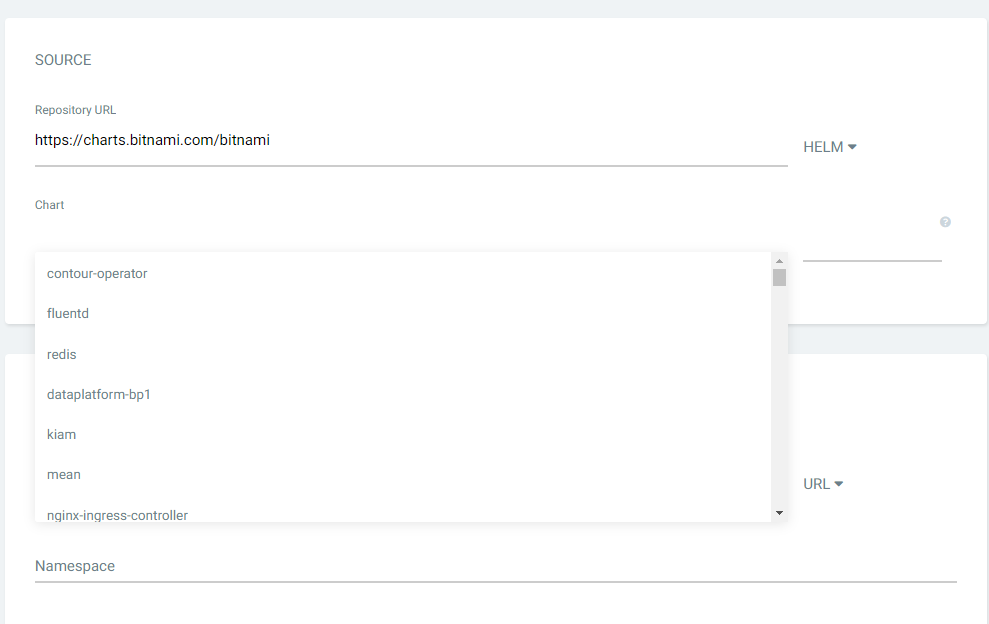 2) Repository URL 에 "https://charts.bitnami.com/bitnami" 를 등록한다. 그러면 아래 Chart에 Bitnami Repo에 등록되어 있는 Chart 목록이 자동으로 보이게 된다.