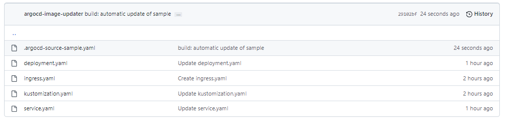기존 git 저장소에 .argocd-source-sample.yaml 이라는 파일이 생성된다. 내용은 이미지 버전 정보이다.