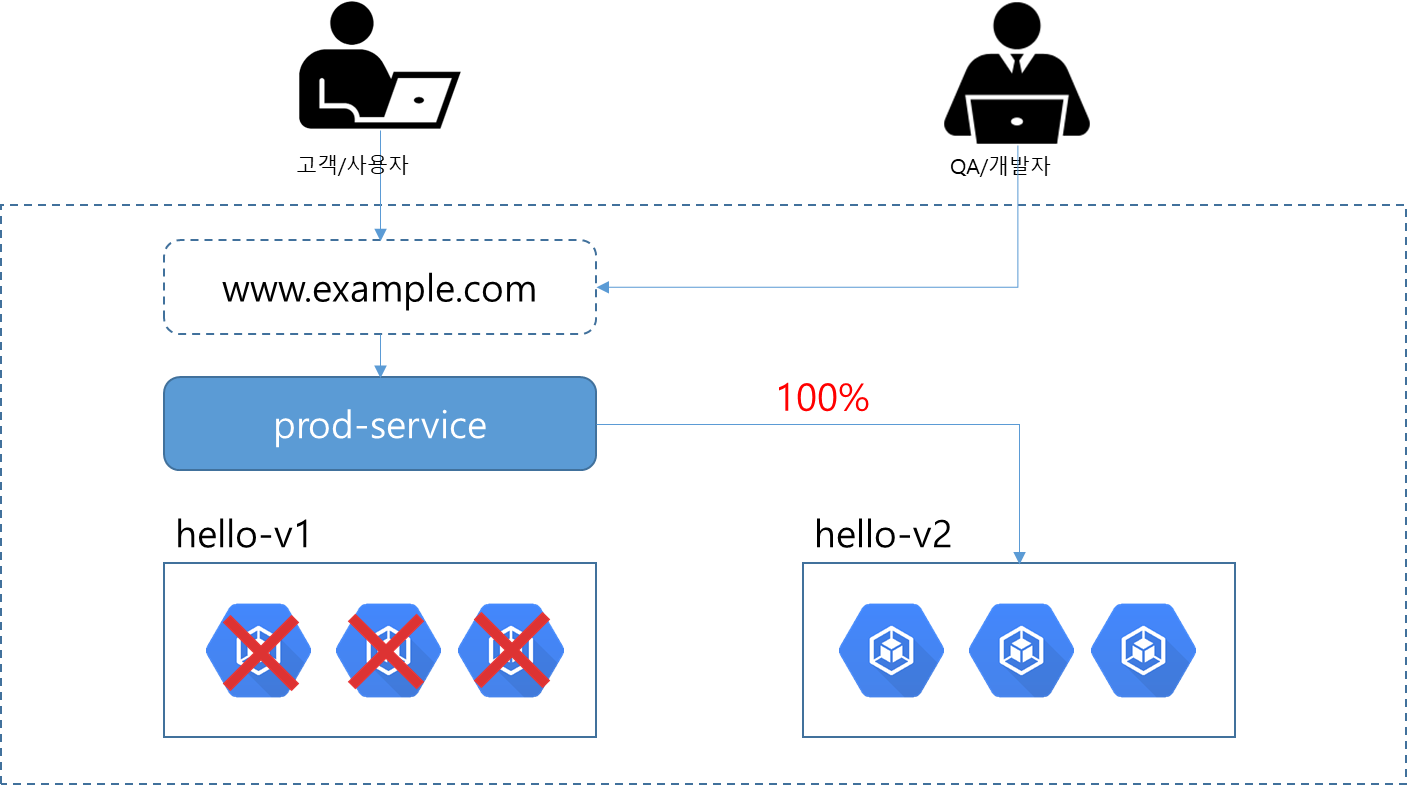 이제 v2의 오류가 없다고 판단되면, v2의 Deployment (hello-v2) replica를 3으로 하고, v1의 Deployment (hello-v1)을 삭제하면 아래와 같이 운영되게 될 것이다.