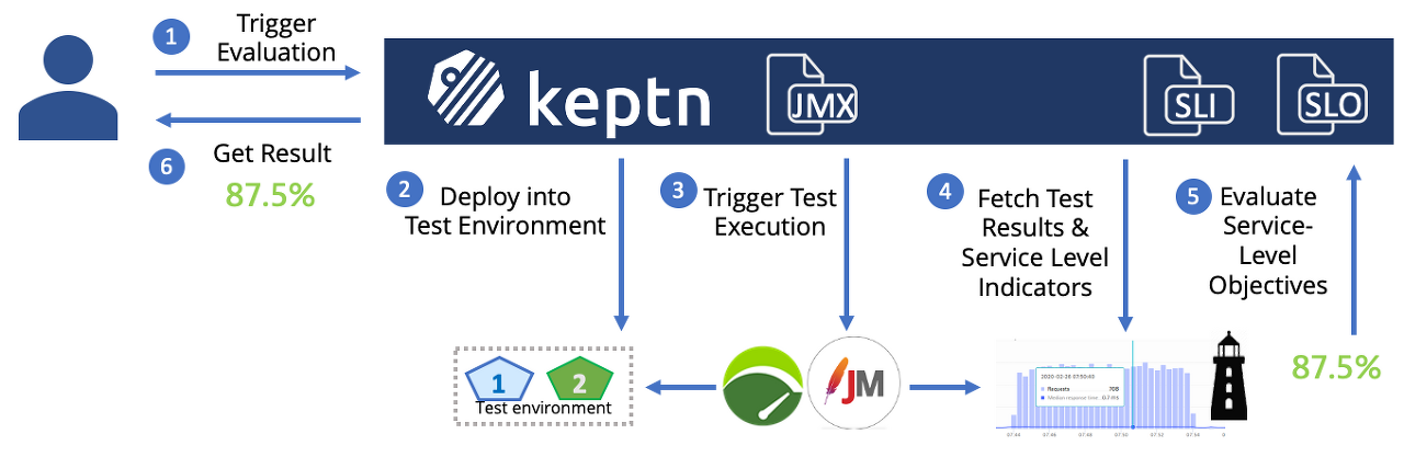 Keptn은 Keptn이 테스트 실행을 트리거하고 이러한 성능 테스트의 결과를 평가하도록 하여 테스트를 자동화하는 데 도움이 된다. 그런 다음 결과는 자동으로 처리되거나 Keptn Bridge에 표시되어 추가 결정을 내릴 수 있다.