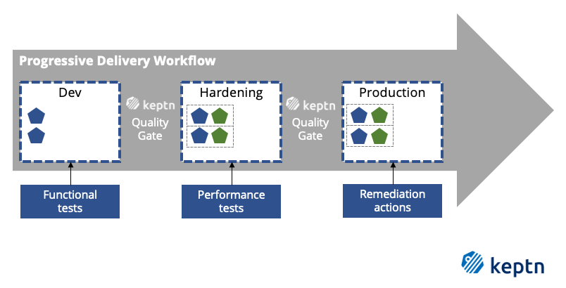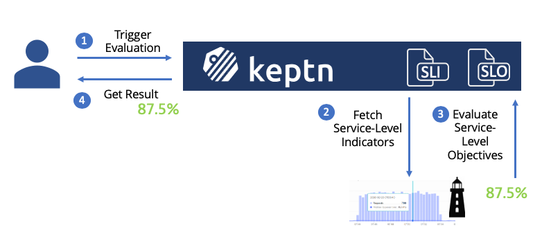 Keptn 품질 게이트는 서비스의 품질 기준을 정의 하는 선언적 방법을 제공한다. Keptn은 이러한 품질 기준을 수집, 평가 및 채점하여 새 릴리스를 다음 단계로 승격할 수 있는지 또는 보류해야 하는지를 결정한다.